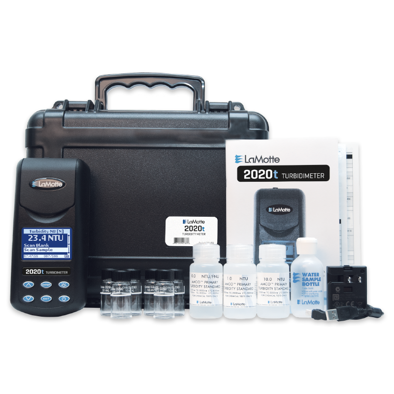 Kits are supplied with 0, 1, and 10 NTU standards (Code 1974-T) or 0, 10, 100 FNU (Code 1974-I), sample bottle, six sample tubes, USB cable and wall adapter, all in a sturdy carrying case.