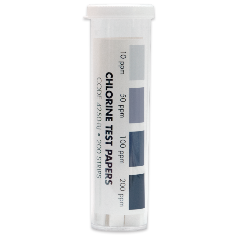 Total Chlorine test papers are chemically treated to indicate sanitizer levels. Range and sensitivity is 10, 50, 100, 200 ppm (200 strips).
