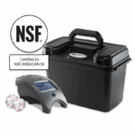 The NSF/ANSI/CAN 50 certification mark on a water quality testing device (WQTD) used in recreational waters, such as pools and spas, means that the product was reviewed and certified by NSF International to meet applicable American National Standards for product design and performance. NSF tests and re-tests products to confirm that they comply with all requirements of certification for performance, accuracy and operating range. Certification levels of L1, L2, and L3 are possible with L1 being the highest rating. Go to www.nsf.org for more information.