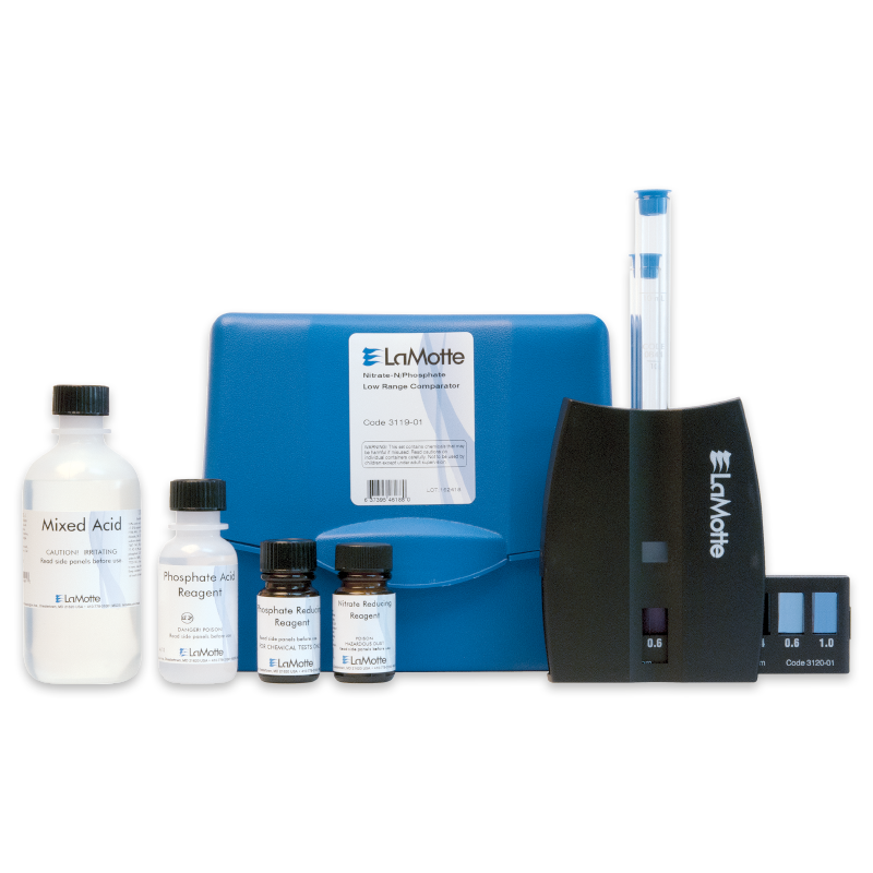 This kit tests for nitrate and phosphate in water using the LRC Comparator. Range/sensitivity is 0.2, 0.4, 0.6, 1.0 ppm NO3–N; 0.2, 0.4, 0.6, 1.0 ppm PO43–.