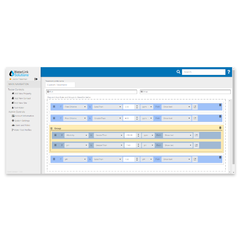 Enter test results manually, or transfer them using WaterLink® Connect 2 and one of LaMotte’s accurate, reliable meters, like the WaterLink® Spin Touch®. Results are stored in WaterLink® Solutions PRO by Site with a date and time the test was performed. But it doesn’t stop there. WaterLink® Solutions PRO Treatment Profile editor provides simple “fill in the blank” rules and a drag and drop interface to build custom water treatment recommendations with previously unseen flexibility.