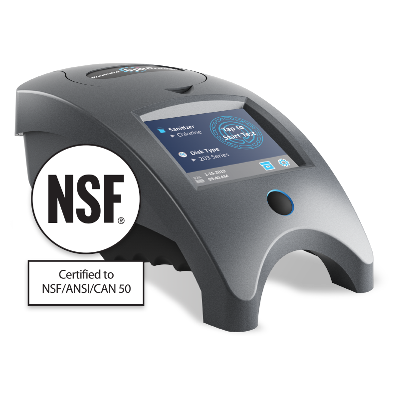 The NSF/ANSI/CAN 50 certification mark on a water quality testing device (WQTD) used in recreational waters, such as pools and spas, means that the product was reviewed and certified by NSF International to meet applicable American National Standards for product design and performance. NSF tests and re-tests products to confirm that they comply with all requirements of certification for performance, accuracy and operating range. Certification levels of L1, L2, and L3 are possible with L1 being the highest rating. Go to www.nsf.org for more information.
